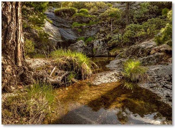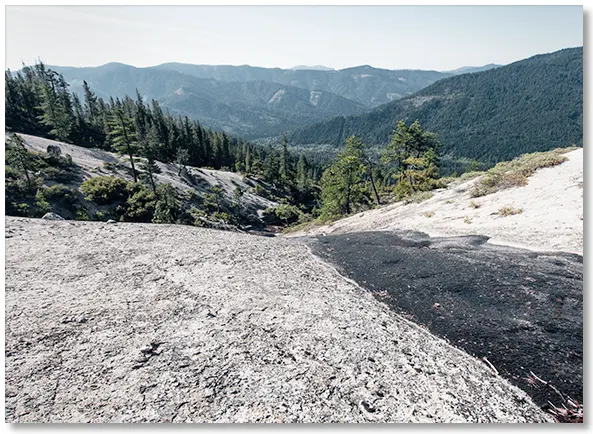 The eroded ridges on either side of the creek are either sandy decomposed granite or solid ready-to-decompose granite, but both are easy to hike on.